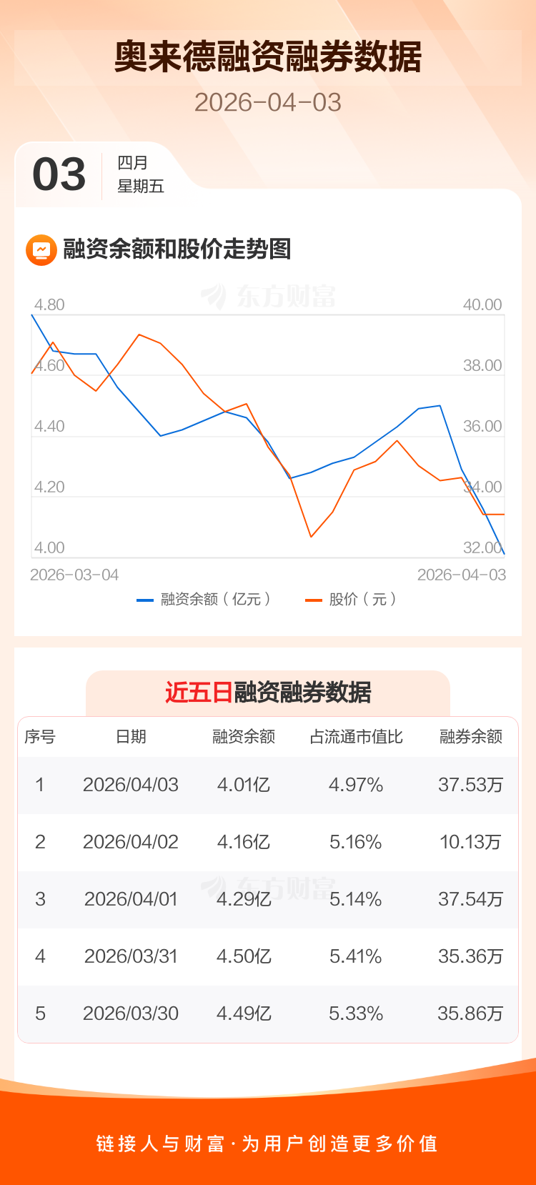 交易所最新数据显示,奥来德于2026年4月3日获融资买入1056.03万元,融资偿还2553.18万元,当日融资净偿还1497.16万元。目前,该股融资余额4.01亿,占流通市值比例为4.97%。