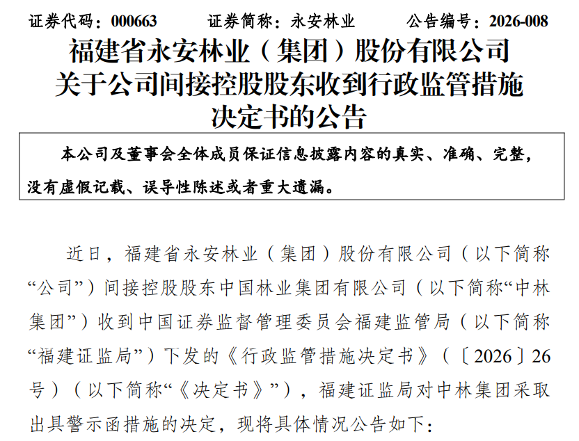 公告称,近日,公司间接控股股东中国林业集团有限公司(以下简称“中林集团”)收到福建证监局下发的《行政监管措施决定书》(以下简称“《决定书》”),福建证监局对中林集团采取出具警示函措施的决定。
