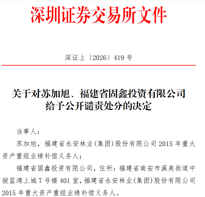 4月3日,深交所发布关于对苏加旭、福建省固鑫投资有限公司(以下简称固鑫投资)给予公开谴责处分的决定。苏加旭、固鑫投资系永安林业2015年重大资产重组业绩补偿义务人。