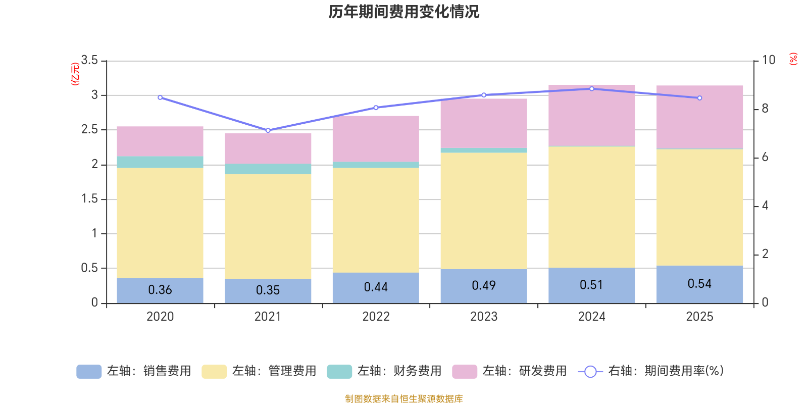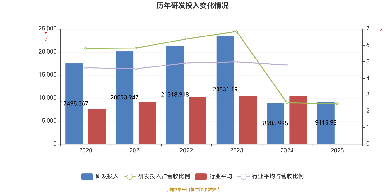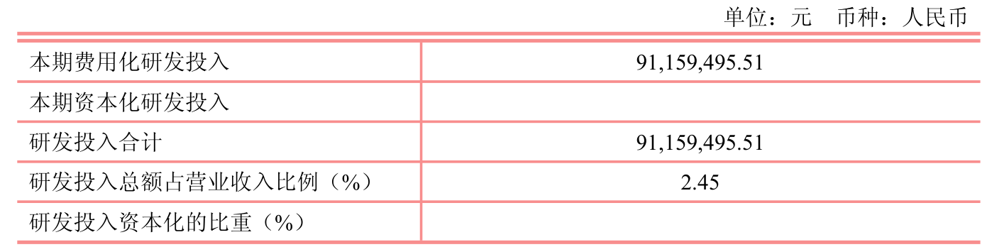2025年全年,公司研发投入金额为9115.95万元,同比增长2.36%;研发投入占营业收入比例为2.45%,相比上年同期下降0.05个百分点。此外,公司全年研发投入资本化率为0%。