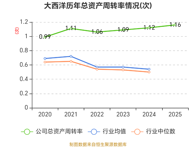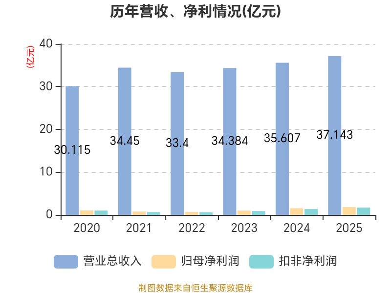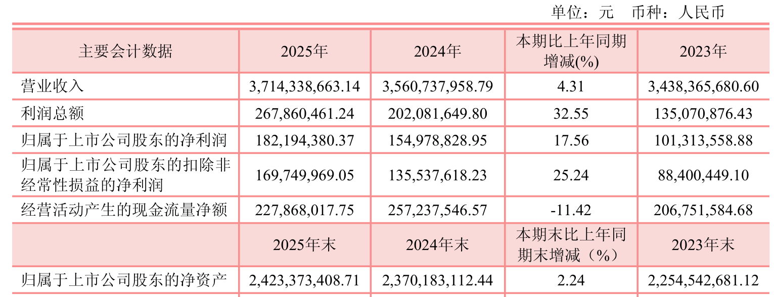 中证智能财讯大西洋(600558)4月7日披露2025年年度报告。2025年,公司实现营业总收入37.14亿元,同比增长4.31%;归母净利润1.82亿元,同比增长17.56%;扣非净利润1.7亿元,同比增长25.24%;经营活动产生的现金流量净额为2.28亿元,同比下降11.42%;报告期内,大西洋基本每股收益为0.203元,加权平均净资产收益率为7.60%。公司2025年度分配预案为:拟向全体股东每10股派现1.2元(含税)。