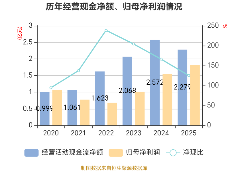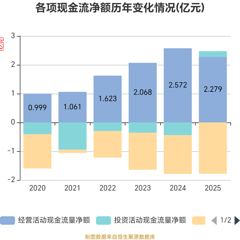 截至2025年,公司经营活动现金流净额为2.28亿元,同比下降11.42%;筹资活动现金流净额-1.78亿元,同比减少4383.31万元;投资活动现金流净额1946.34万元,上年同期为-4447.1万元。