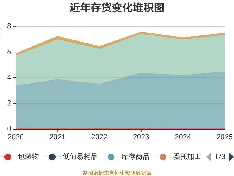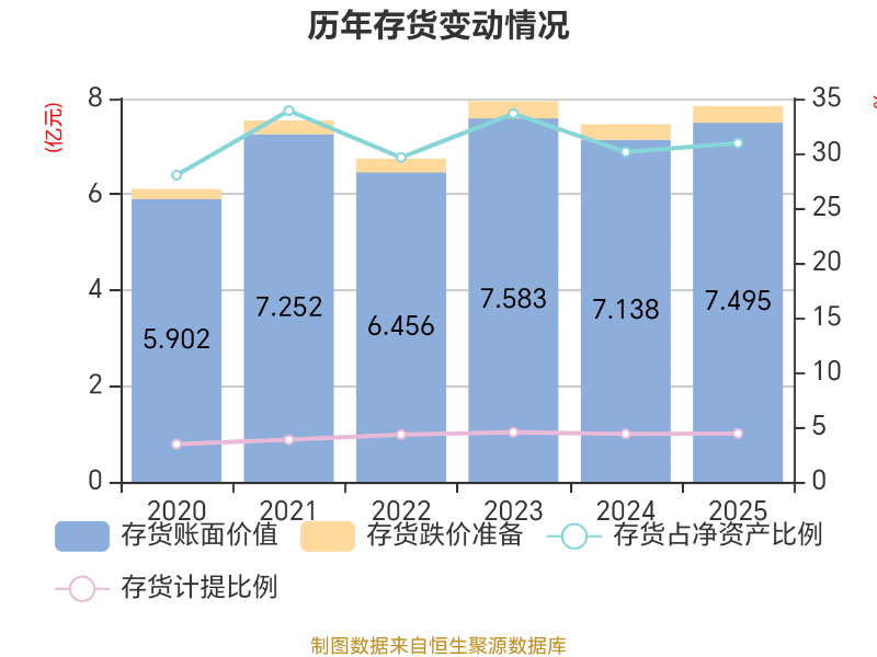 从存货变动来看,截至2025年末,公司存货账面价值为7.5亿元,占净资产的30.93%,较上年末增加3572.35万元。其中,存货跌价准备为3457.26万元,计提比例为4.41%。