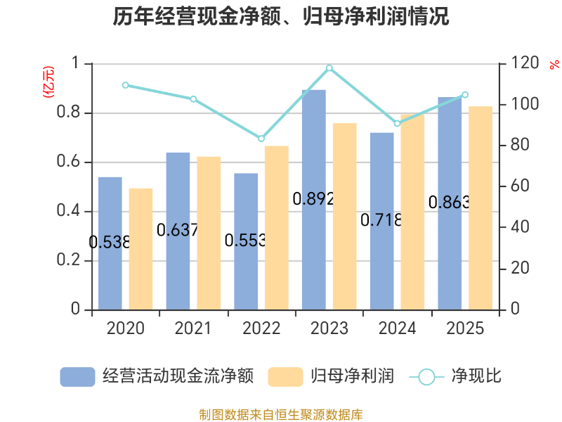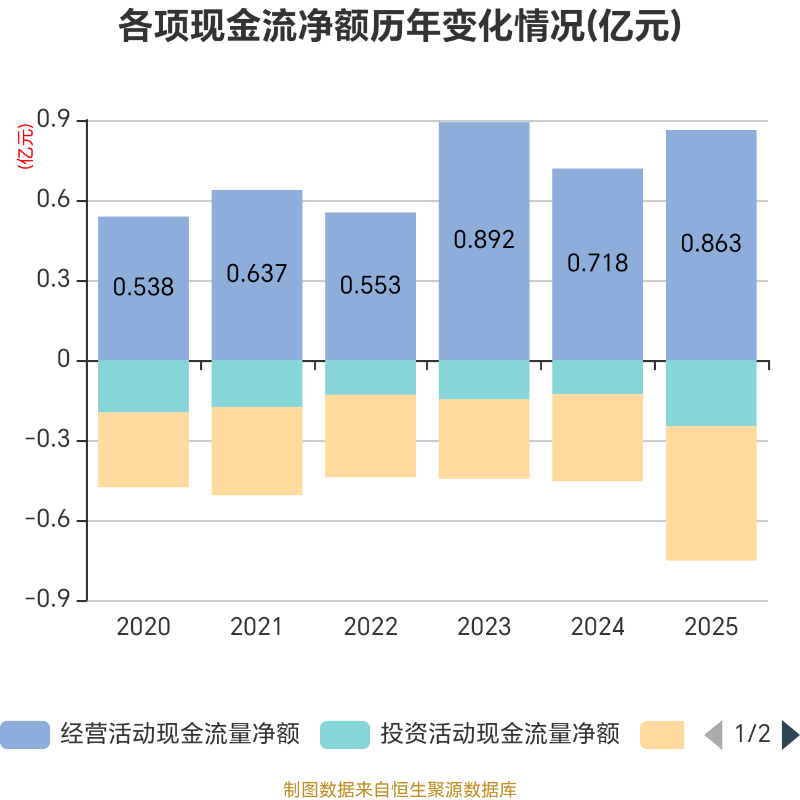 截至2025年,公司经营活动现金流净额为8634.87万元,同比增长20.3%;筹资活动现金流净额-5044.06万元,同比减少1773.16万元;投资活动现金流净额-2483.91万元,上年同期为-1277.76万元。