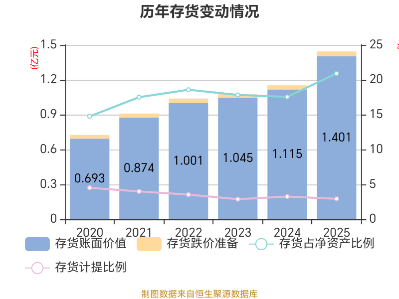 从存货变动来看,截至2025年末,公司存货账面价值为1.4亿元,占净资产的20.9%,较上年末增加2860.35万元。其中,存货跌价准备为422.72万元,计提比例为2.93%。