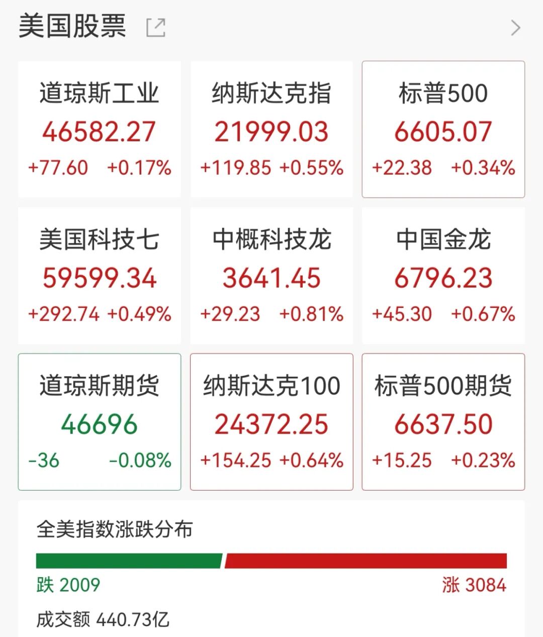 4月6日,美股三大指数集体飘红,截至22:00,道指涨0.17%,纳指涨0.55%,标普500涨0.34%。