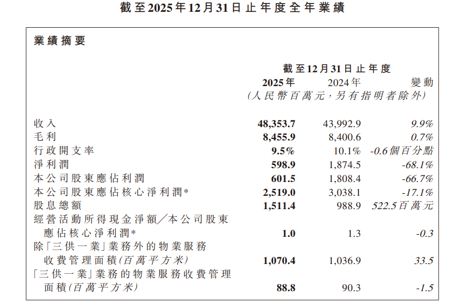 值得一提的是,在净利暴跌近七成的背景下,碧桂园服务在股东回报上的姿态却格外慷慨。董事会建议派发2025年度末期股息每股人民币4.62分及特别股息每股人民币41.80分,合计约15.11亿元,同比增加逾5亿元。据此计算,现金分红总额相当于2025年全年净利润的2.5倍以上。