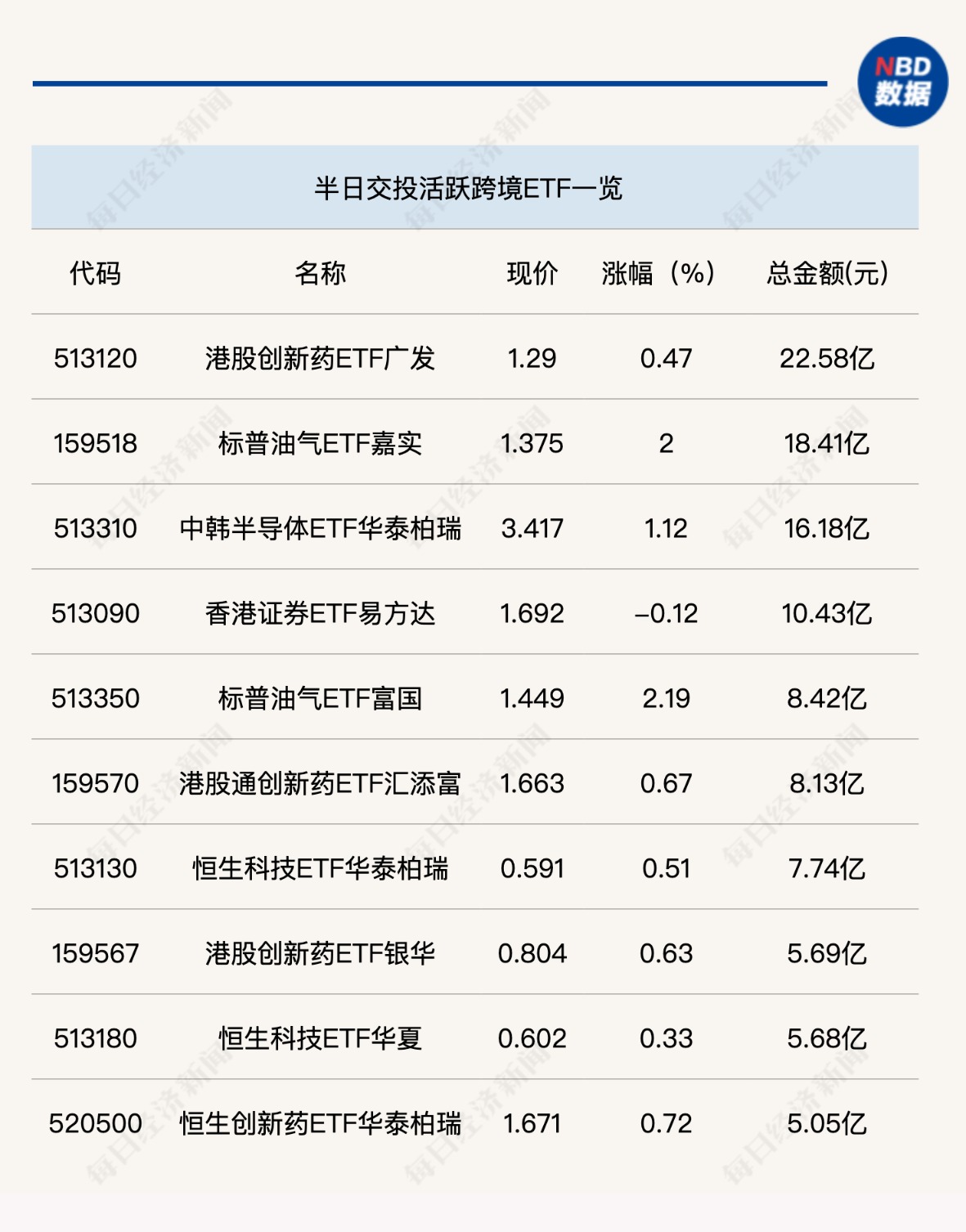 今日,科创芯片ETF嘉实(588200)半日成交额为15.68亿元,是行业、主题类ETF半日唯一成交超过10亿元的ETF。跨境ETF方面,港股创新药ETF广发(513120)半日成交金额为22.58亿元。