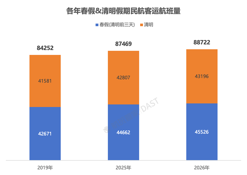 据DAST交通数据速递,2026年春假&清明6天民航执行客运航班量达8.87万班次,日均达12675班次,同比2025年增长1.4%,同比2019年增长5.3%。分时间段来看,清明前三天同比增长1.9%、同比2019年增长6.7%;清明期间同比增长0.9%、同比2019年增长3.9%,清明假期增幅要低于春假增幅。