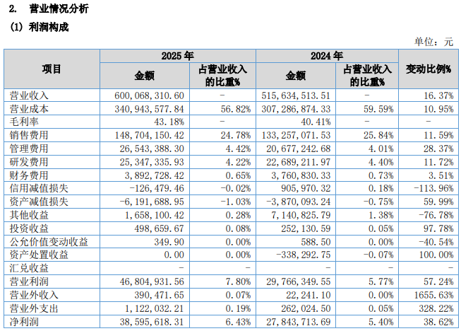 尽管公司营收、净利均呈双位数增长,经营现金流净额也大增97%,展现出较高的盈利质量和造血能力,但年报也显示,公司管理费用、财务费用、销售费用、研发费用均有不同程度增加。其中,2025年管理费用同比增长28.37%,显著高于16.37%的营收增速。
