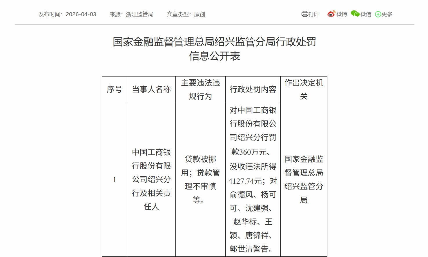 信息公开表显示,国家金融监督管理总局绍兴监管分局对中国工商银行股份有限公司绍兴分行罚款360万元、没收违法所得4127.74元;对相关责任人俞德风、杨可可、沈建强、赵华标、王颖、唐锦祥、郭世清警告。