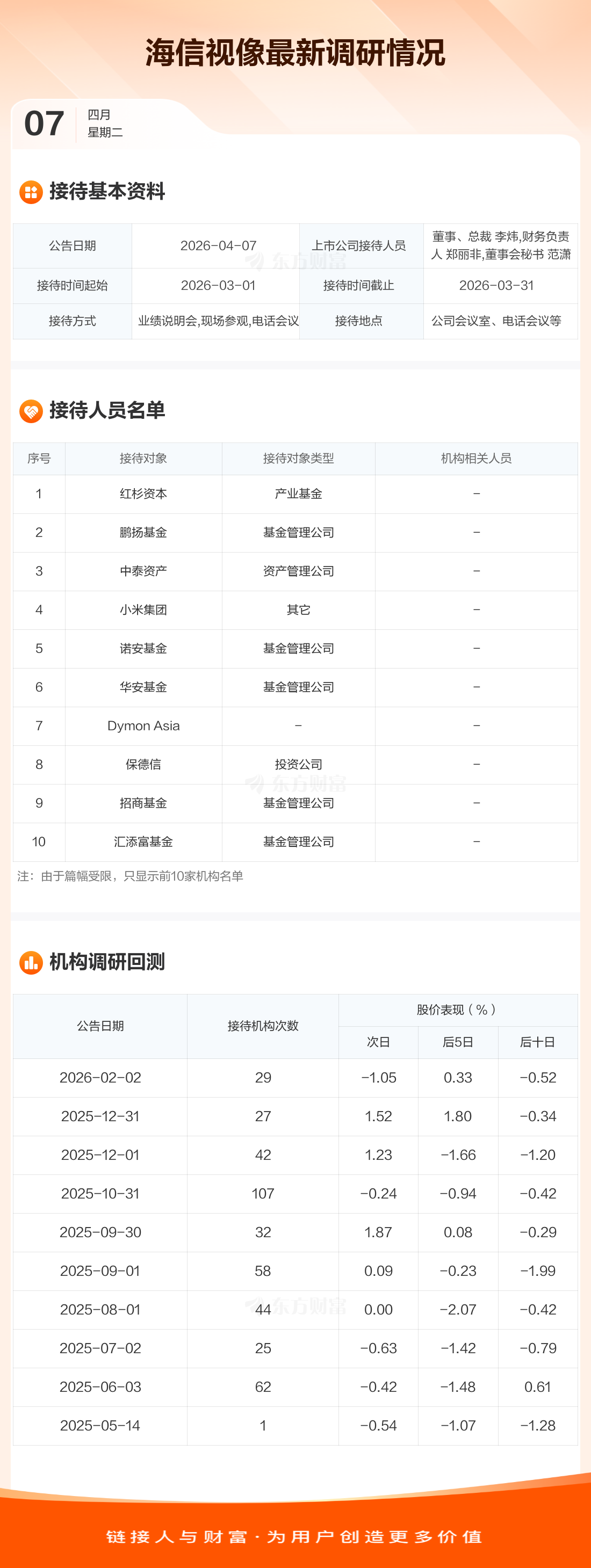 海信视像4月7日公告称,3月1日至3月31日接待红杉资本等88家机构调研。接待人员包括董事、总裁 李炜,财务负责人 郑丽非,董事会秘书 范潇。