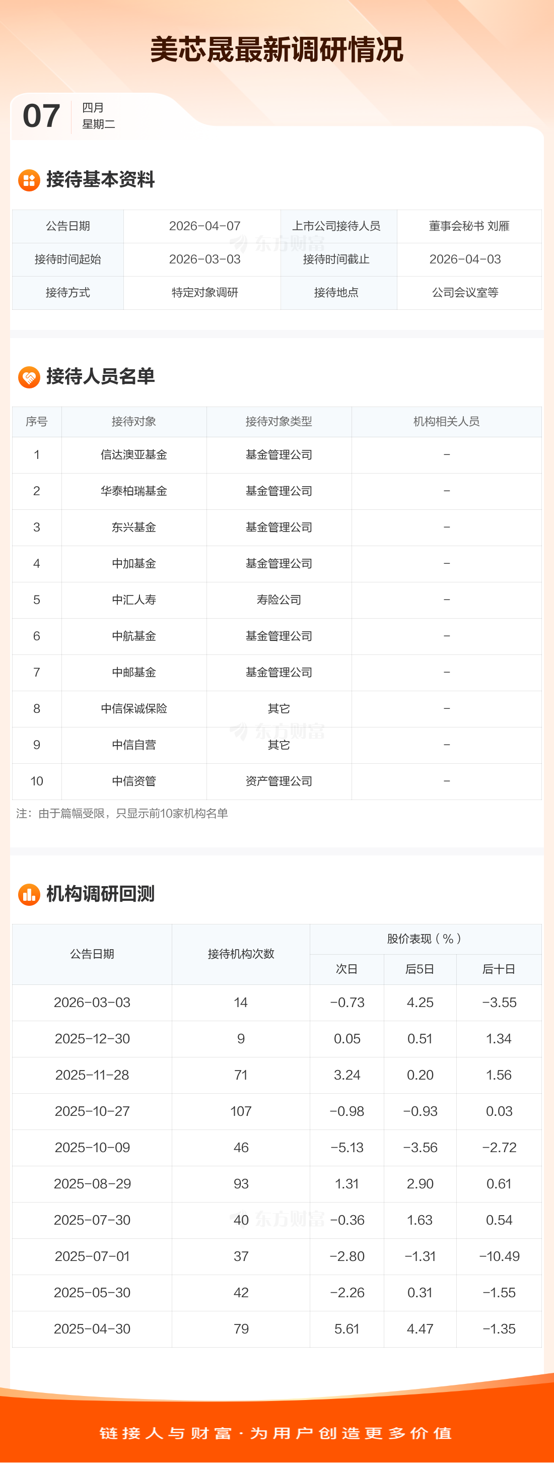 美芯晟4月7日公告称,3月3日至4月3日接待信达澳亚基金等38家机构调研。接待人员包括董事会秘书 刘雁。