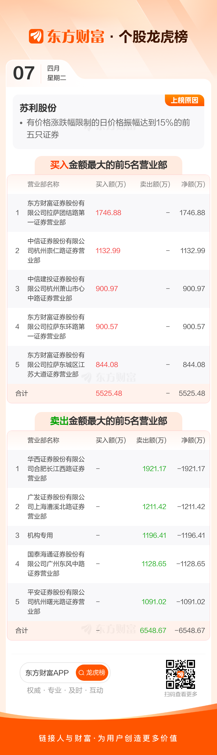 交易所2026年4月7日公布的交易公开信息显示,苏利股份因成为有价格涨跌幅限制的日价格振幅达到15%的前五只证券上榜。苏利股份当日收报25.6元,涨跌幅4.45%,偏离值16.16%,换手率16.49%,成交额7.62亿。