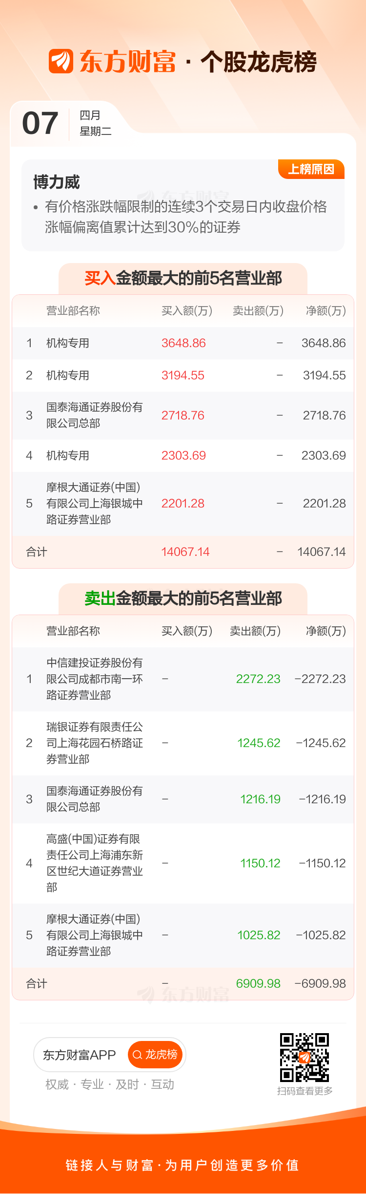 交易所2026年4月7日公布的交易公开信息显示,博力威因成为有价格涨跌幅限制的日收盘价格涨幅达到15%的前五只证券、有价格涨跌幅限制的连续3个交易日内收盘价格涨幅偏离值累计达到30%的证券上榜。博力威当日收报51.6元,涨跌幅20.00%,偏离值20.00%,换手率8.75%,成交额4.26亿。异常期间4月3日至4月7日,期间涨幅32.72%,累计偏离值31.78%,区间成交额6.65亿。