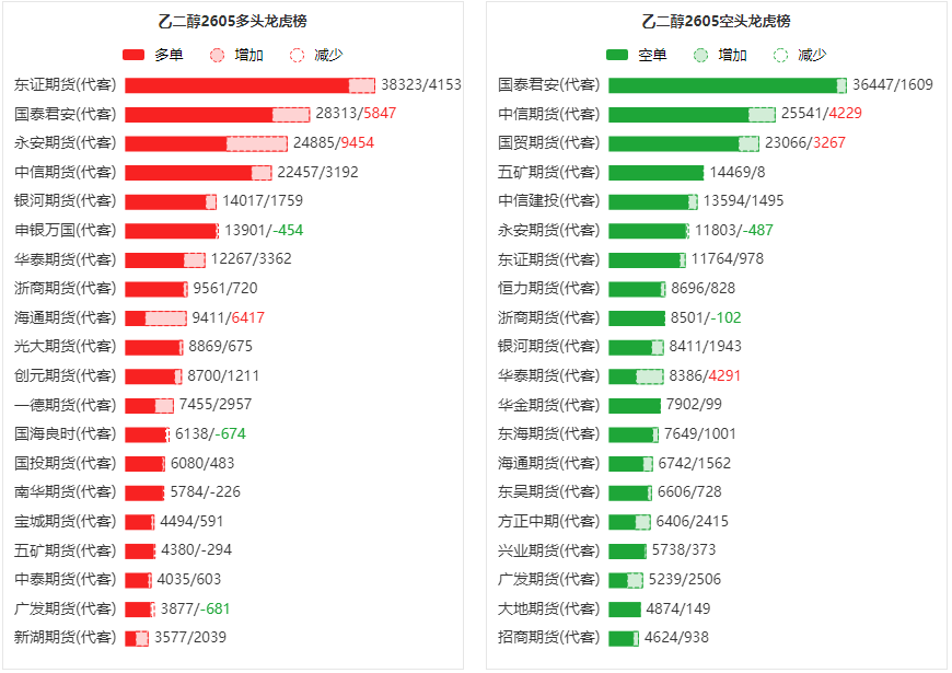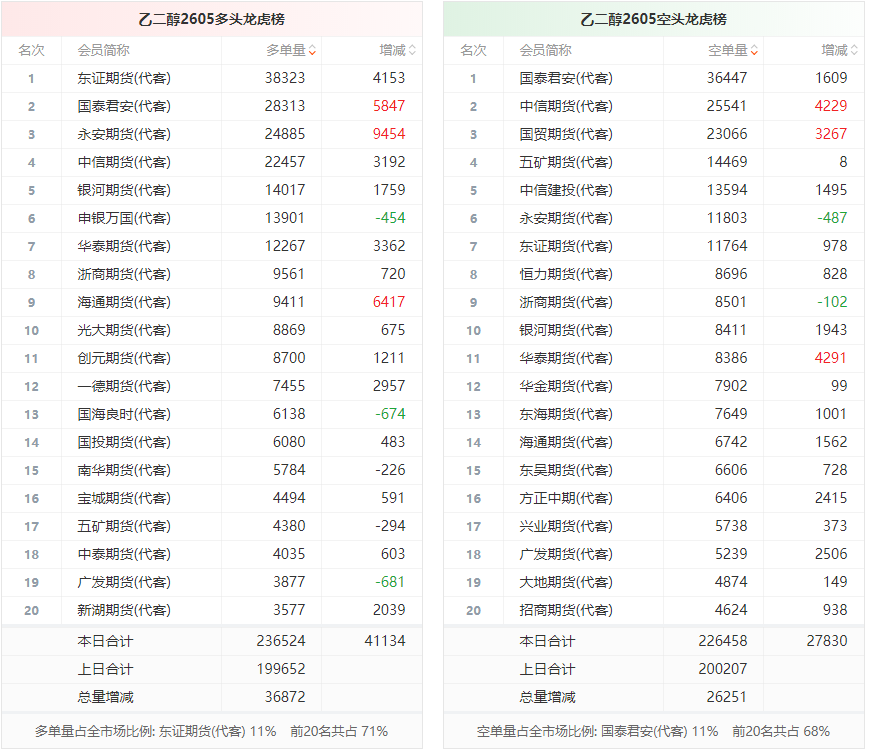 总体而言,乙二醇2605合约今日增仓上行,多空持仓排名前20席中,多空双方均呈进场态势,多头进场意愿强于空头。