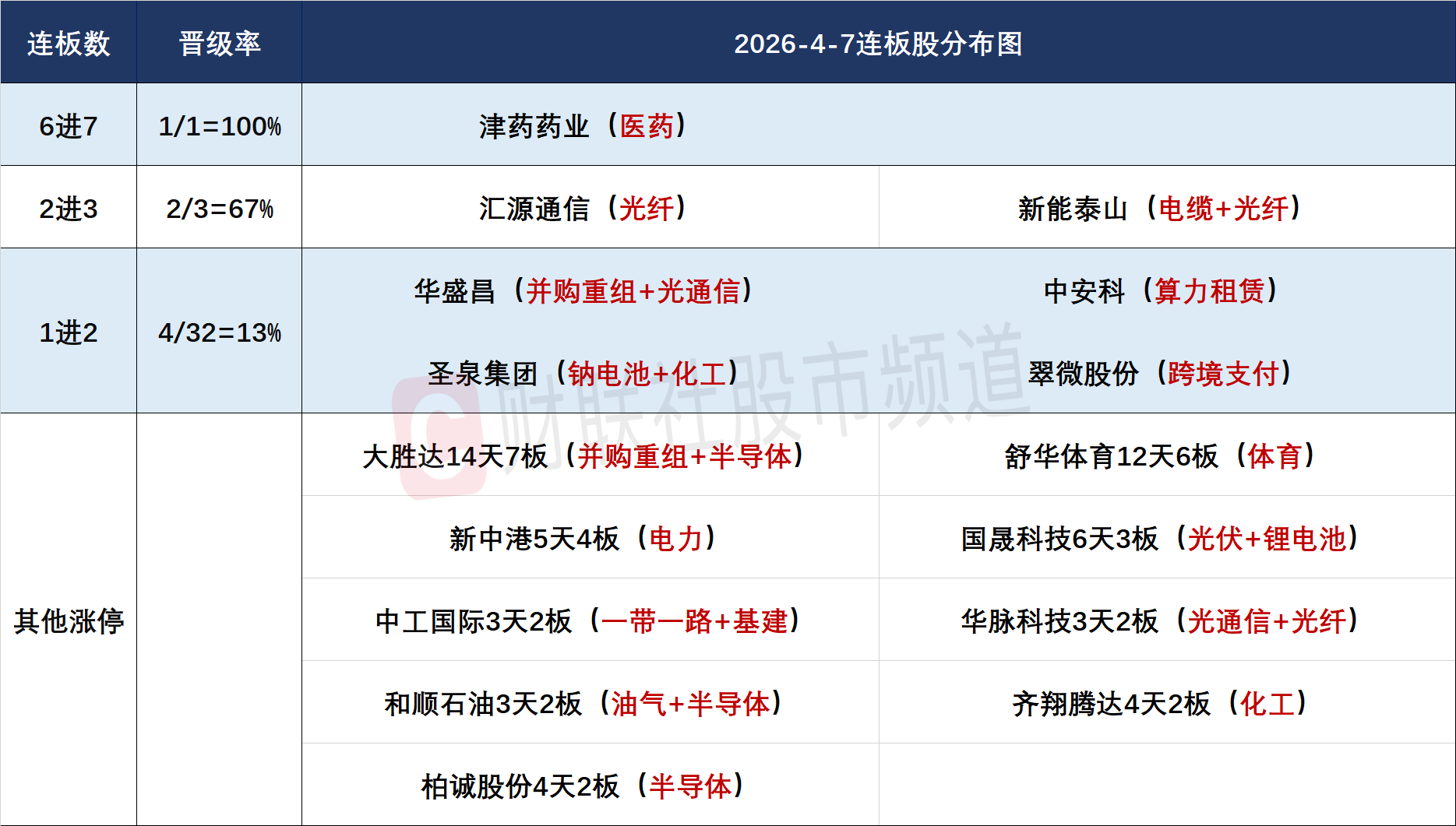 连板晋级率升至75%,仅有重药控股未能实现晋级3连板,最高标津药药业实现6进7,带动新能泰山、大胜达、舒华体育等高位人气股涨停。随着上市公司进入业绩密集披露期,市场整体风偏持续不足,一些高景气涨价方向持续获得资金深度抱团,此前深幅调整的化工板块重获资金回流并实现大面积涨停,进而带动稀土永磁、小金属等方向卷土重来。此外算力硬件股热度居高不下,光缆人气抱团股新能泰山在上周四完成反包后连续两日实现连板晋级。此外受中东局势不确定性影响,在当前上市公司业绩披露期,市场风险偏好的不足加上量能匮乏,一些业绩确定性高的涨价概念以及部分独立逻辑板块仍是当前活跃资金优先选择方向。
