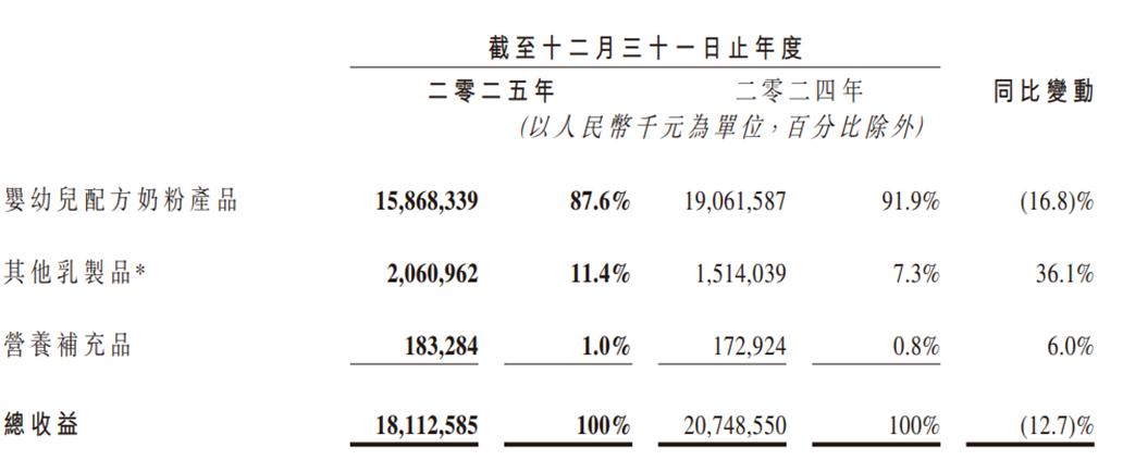 从业务结构来看,作为核心支柱的婴幼儿配方奶粉业务,成为营收下滑的主要拖累。公司财报显示,2025年飞鹤婴幼儿配方奶粉产品实现收益158.68亿元,占总收益的87.6%,但同比下滑16.8%,这是该业务占比近年来首次跌破九成,标志着飞鹤长期依赖的单一增长引擎开始熄火。