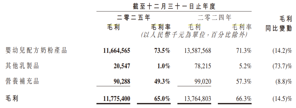 营收下滑的同时,飞鹤的盈利能力也出现大幅缩水。2025年,公司实现毛利117.75亿元,同比下滑14.5%;毛利率为65.0%,较2024年的66.3%下降1.3个百分点,看似小幅下滑,但结合营收规模来看,盈利空间被进一步压缩。