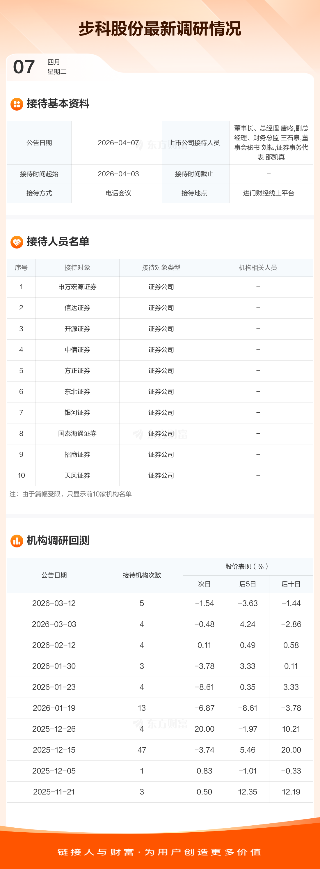 步科股份4月7日公告称,4月3日接待申万宏源证券等42家机构调研。接待人员包括董事长、总经理 唐咚,副总经理、财务总监 王石泉,董事会秘书 刘耘,证券事务代表 邵凯真。