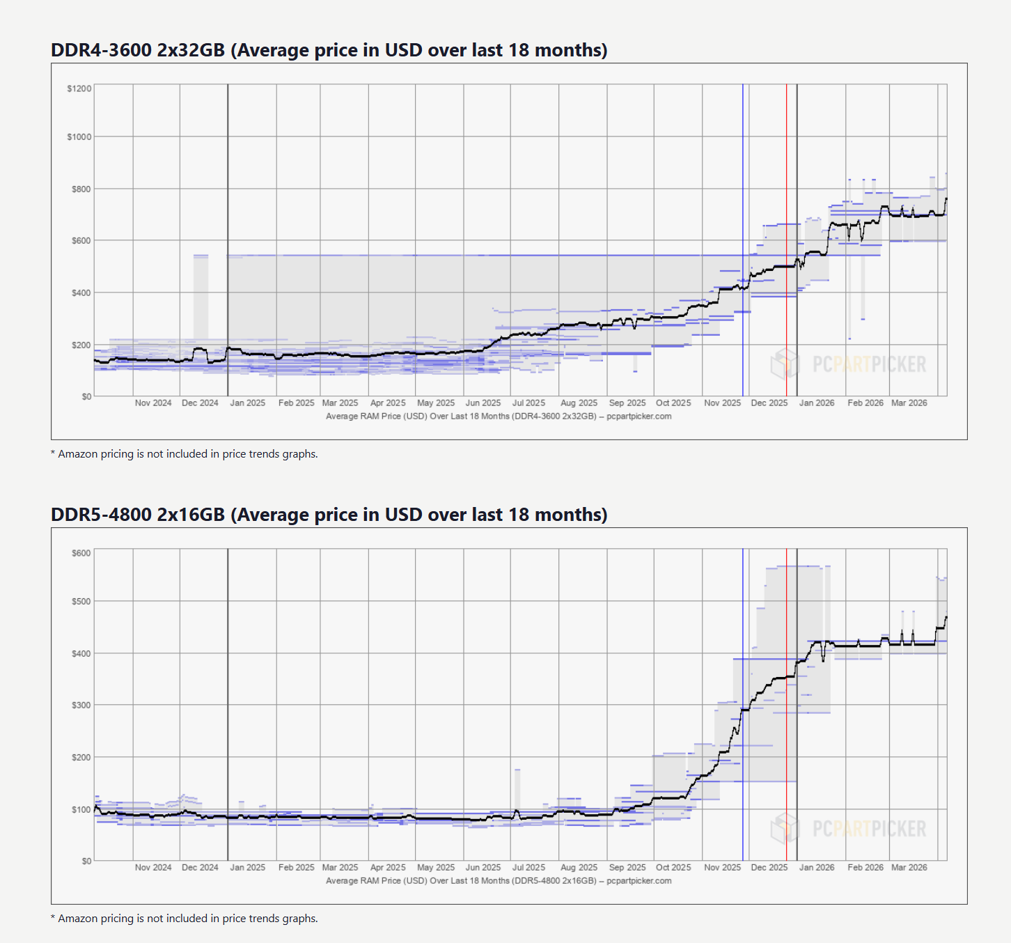 多项数据也印证了这一点。截至3月底,DRAMeXchange数据显示,C端DDR4 8Gb颗粒的固定合约价环比持平;PCPartPicker数据则显示,近期DDR4与DDR5成品价格并未出现明显下跌,反而有小幅上行。
