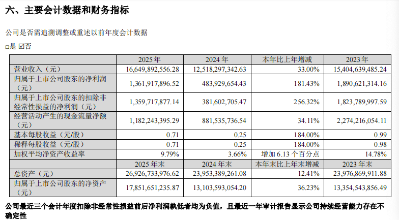 然而翻查过去多年业绩,2025年实现13.62亿元的净利润,尚不足2022年57.14亿元的四分之一,2023年和2024年净利润同比下滑幅度均约为70%左右。
