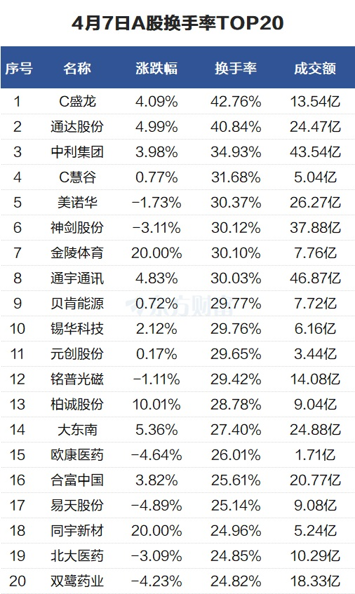 当天换手率最高的个股为C盛龙,全天换手率42.76%。通达股份紧随其后,全天换手率40.84%。