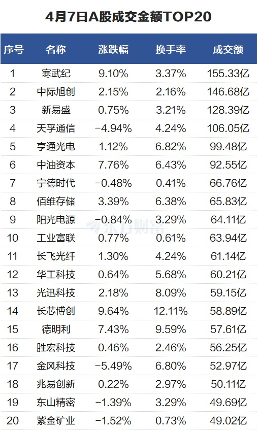 沪深两市成交额1.61万亿元,较上一交易日缩量421亿元。个股方面,寒武纪当日成交155.33亿元。中际旭创当日成交146.68亿元。