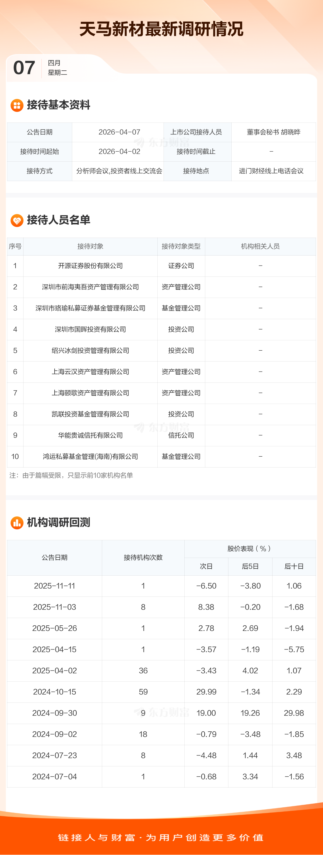 天马新材4月7日公告称,4月2日接待开源证券股份有限公司等23家机构调研。接待人员包括董事会秘书 胡晓晔。
