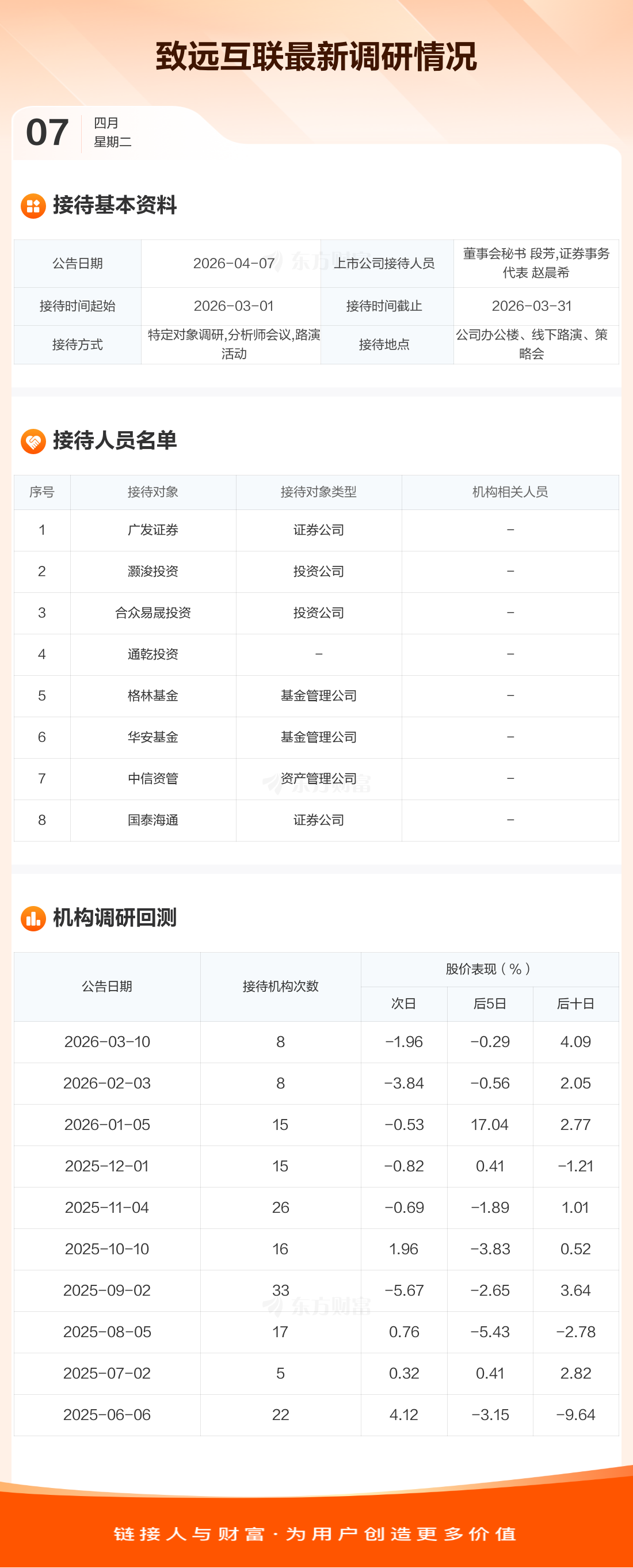 致远互联4月7日公告称,3月1日至3月31日接待广发证券等8家机构调研。接待人员包括董事会秘书 段芳,证券事务代表 赵晨希。