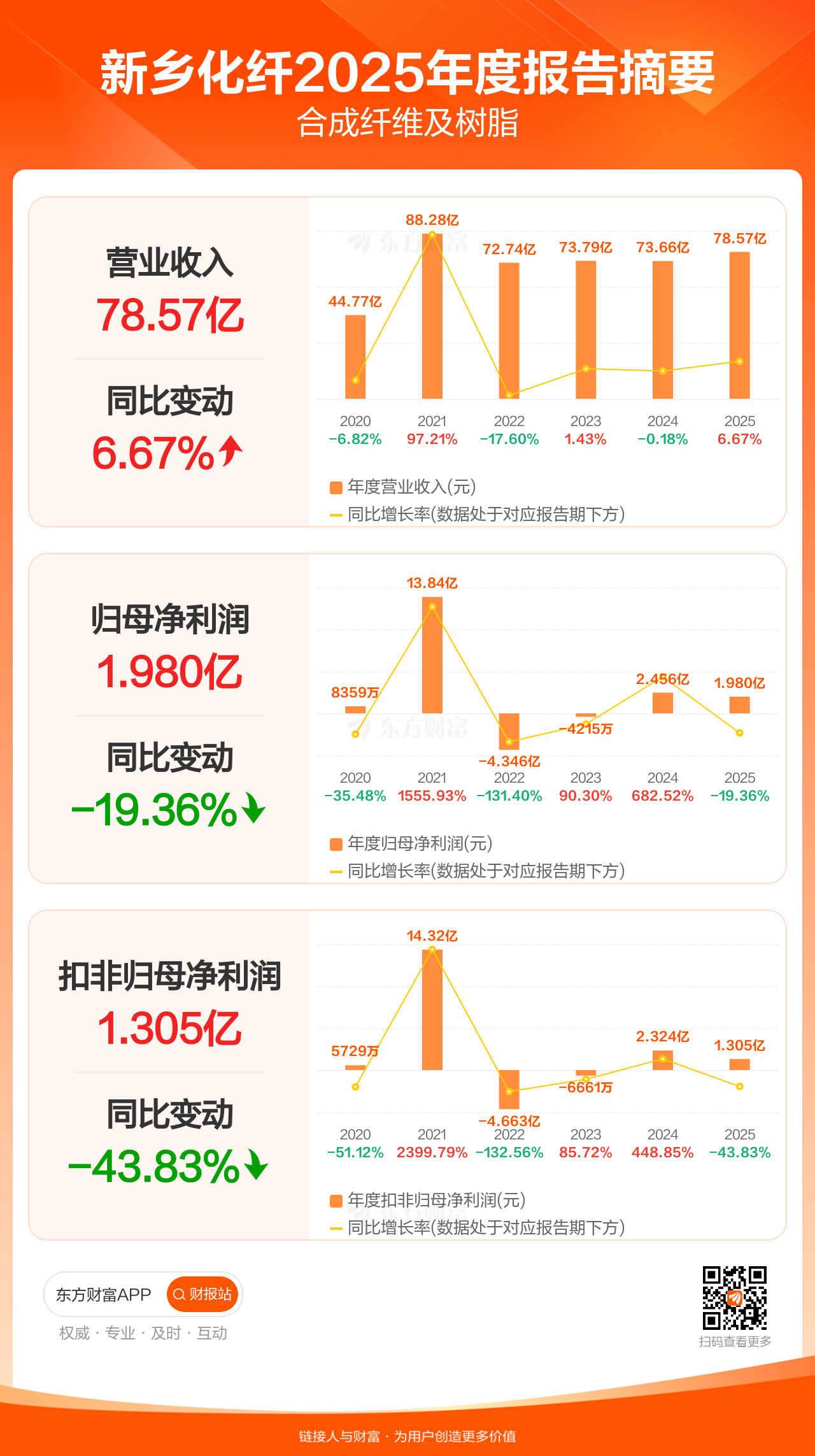 新乡化纤4月8日发布2025年年报显示,公司全年实现营业收入78.57亿元,同比增长6.67%;归母净利润1.98亿元,同比下滑19.36%;扣非归母净利润1.31亿元,同比下滑43.83%。