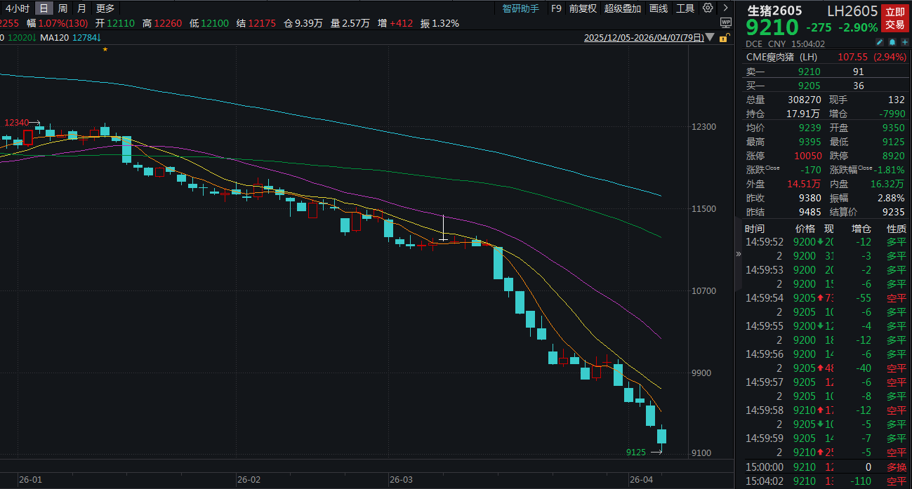 4月7日,生猪期货主力2605合约盘中最低跌至9125元/吨,续创上市以来的新低。