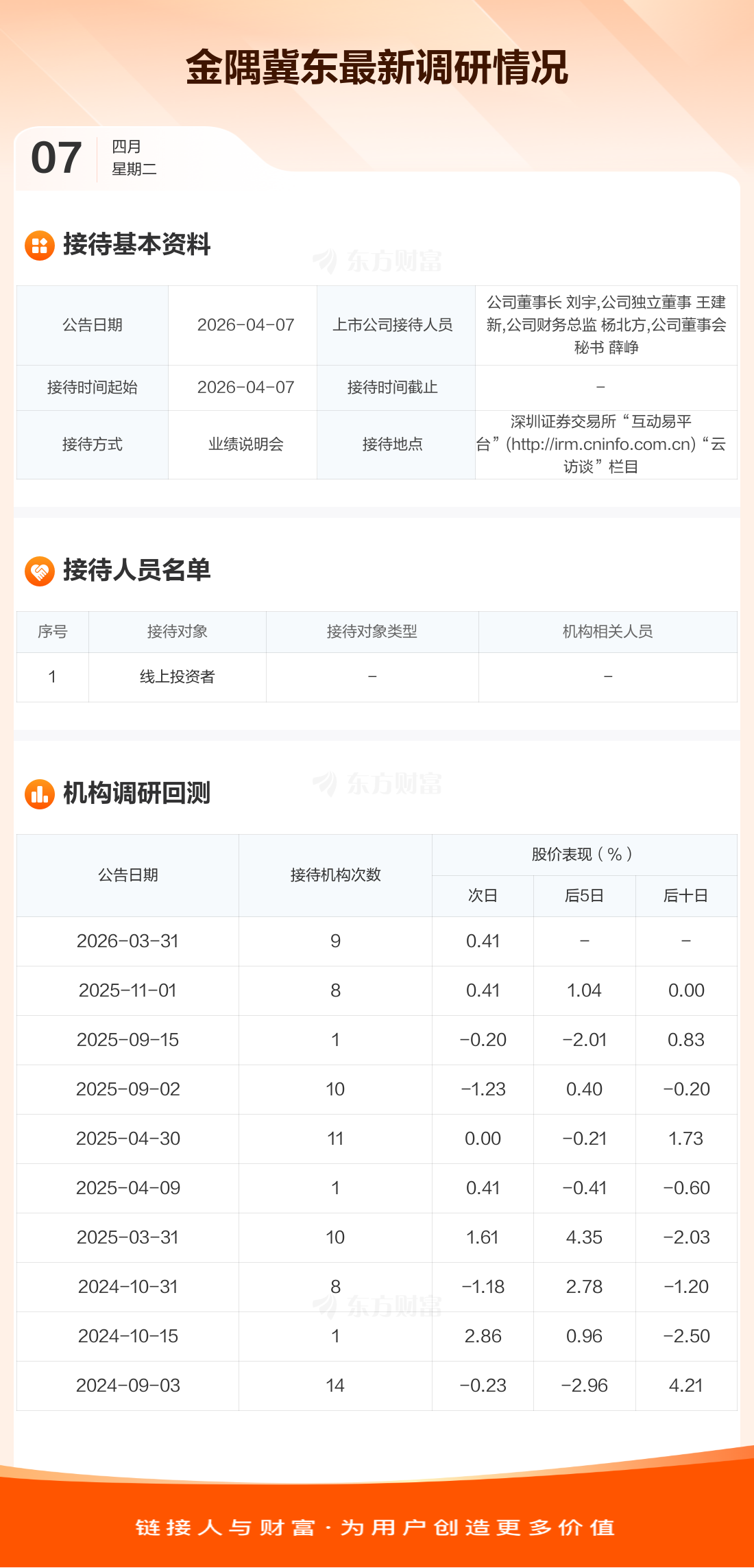 金隅冀东4月7日公告称,4月7日接待线上投资者等1家机构调研。接待人员包括公司董事长 刘宇,公司独立董事 王建新,公司财务总监 杨北方,公司董事会秘书 薛峥。