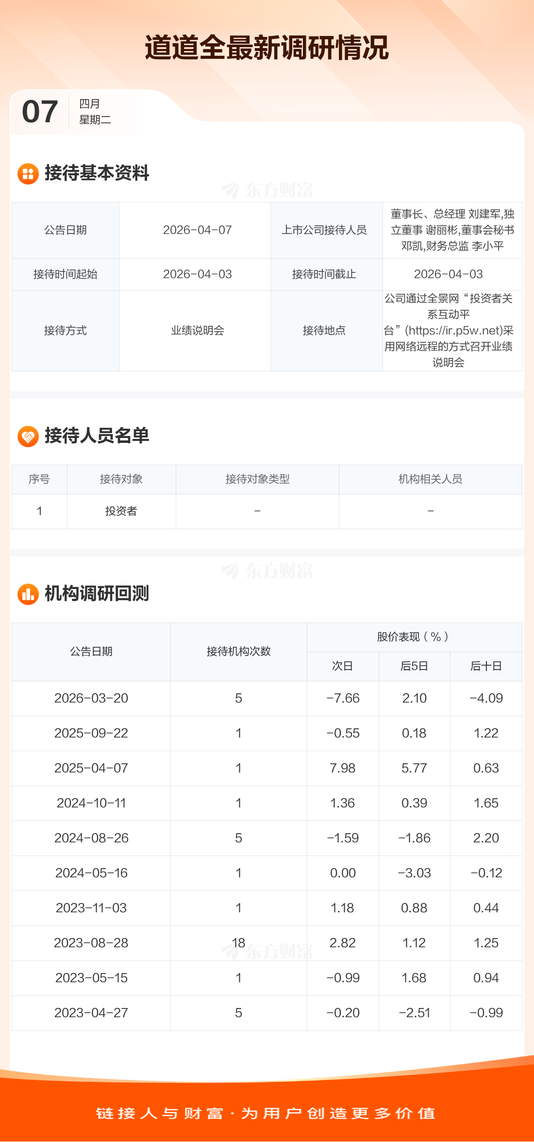 道道全4月7日公告称,4月3日接待投资者等1家机构调研。接待人员包括董事长、总经理 刘建军,独立董事 谢丽彬,董事会秘书 邓凯,财务总监 李小平。