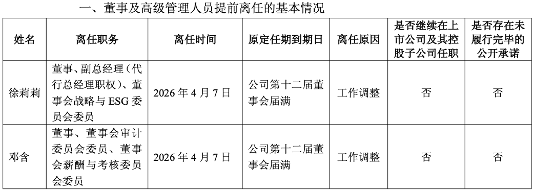 4月7日,金枫酒业(600616)发布公告,近日,公司董事会收到董事副总经理(代行总经理职权)徐莉莉及董事邓含提交的辞职申请,因工作调整,徐莉莉申请辞去公司董事、副总经理(代行总经理职权)及董事会战略与ESG委员会委员职务,辞职后将不再担任公司任何职务;因工作调整,邓含申请辞去公司董事、董事会审计委员会委员、董事会薪酬与考核委员会委员职务,辞职后将不再担任公司任何职务。