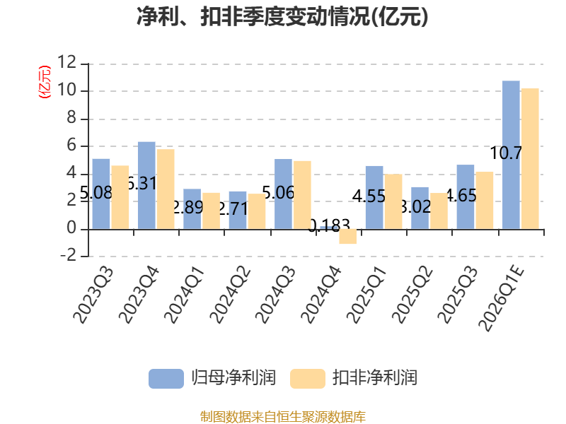 中证智能财讯东山精密(002384)4月7日晚间披露业绩预告,预计2026年一季度归母净利润10亿元至11.5亿元,同比增长119.36%-152.27%;扣非净利润预计9.6亿元至10.8亿元,同比增长141.97%-172.21%;基本每股收益0.55元/股-0.63元/股。以最新收盘价计算,市净率(LF)约9.37倍,市销率(TTM)约5.34倍。