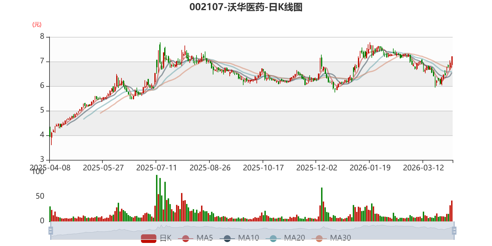 以4月7日收盘价计算,沃华医药目前市盈率(TTM)约为37.95倍,市净率(LF)约6.15倍,市销率(TTM)约5.08倍。