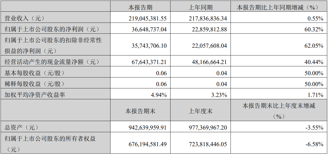 中证智能财讯沃华医药(002107)4月8日披露2026年第一季度报告。公司实现营业总收入2.19亿元,同比增长0.55%;归母净利润3664.87万元,同比增长60.32%;扣非净利润3574.37万元,同比增长62.05%;经营活动产生的现金流量净额为6764.34万元,同比增长40.44%;报告期内,沃华医药基本每股收益为0.06元,加权平均净资产收益率为4.94%。