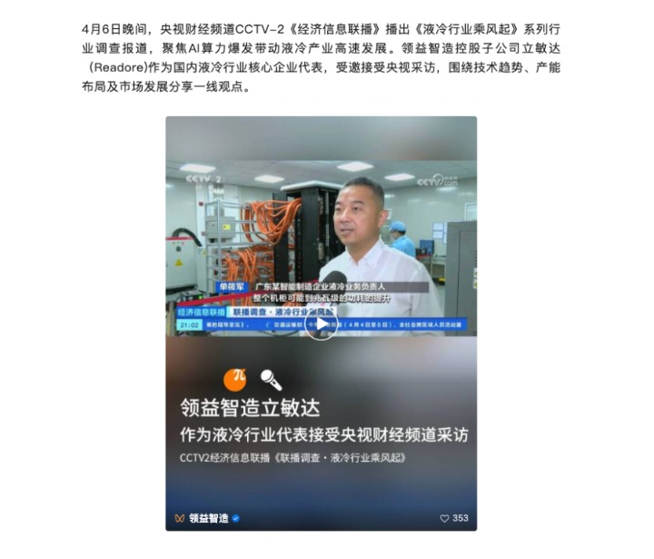 值得一提的是,4月7日,领益智造在其官方微信公众号透露,控股子公司立敏达(Readore)作为国内液冷行业核心企业代表,近期受邀接受央视采访。记者从访谈中获悉,其分水器和液冷板业务,去年出货量有10万(套)级,2026年年产能将达到百万(套)级。