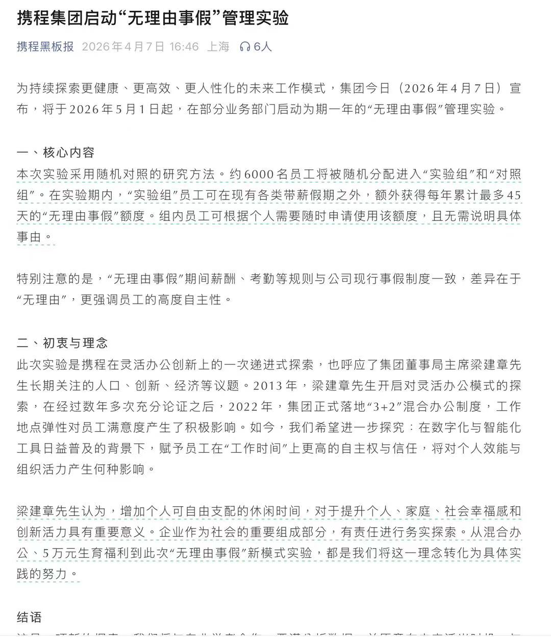 4月7日,据携程黑板报微信公众号消息,携程集团宣布将于2026年5月1日起,在部分业务部门启动为期一年的“无理由事假”管理实验。