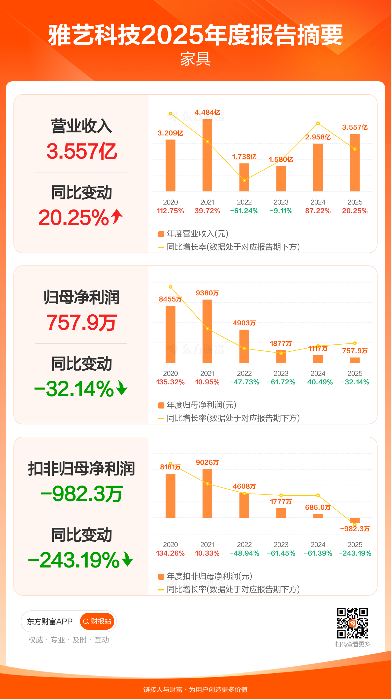 雅艺科技4月8日发布2025年年报显示,公司全年实现营业收入3.56亿元,同比增长20.25%;归母净利润757.93万元,同比下滑32.14%;扣非归母净利润-982.25万元。