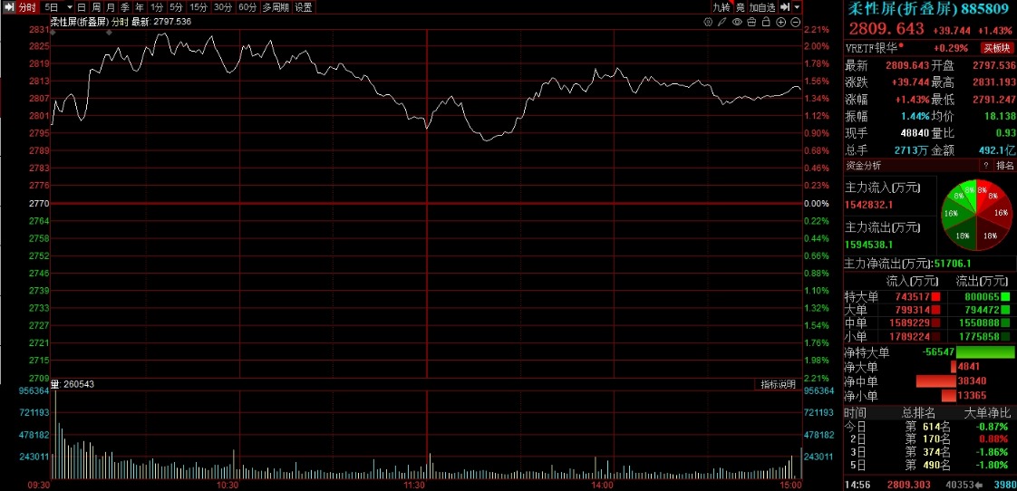 上证报中国证券网讯(记者邹传科)鉴于苹果折叠屏手机的最新进展,柔性屏(折叠屏)板块再次受到市场关注。4月7日,柔性屏(折叠屏)板块上涨,概念指数收涨1.43%。其中,福蓉科技一字涨停,全天封死涨停板;大富科技、联得装备、精研科技、宜安科技等个股跟涨。
