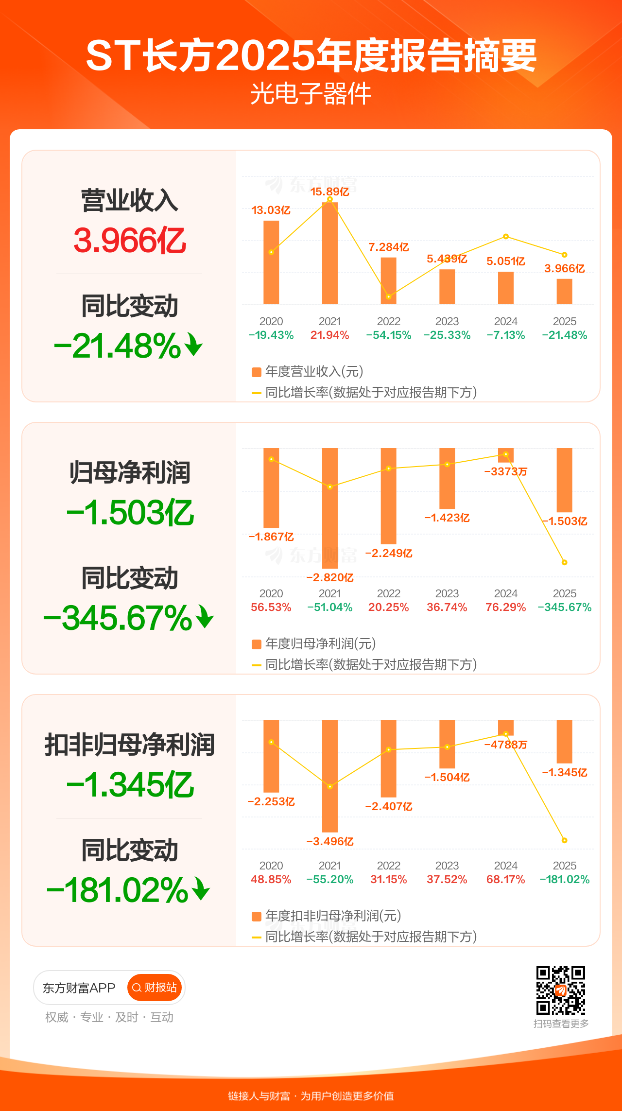 ST长方4月8日发布2025年年报显示,公司全年实现营业收入3.97亿元,同比下滑21.48%;归母净利润-1.50亿元;扣非归母净利润-1.35亿元。