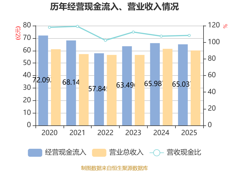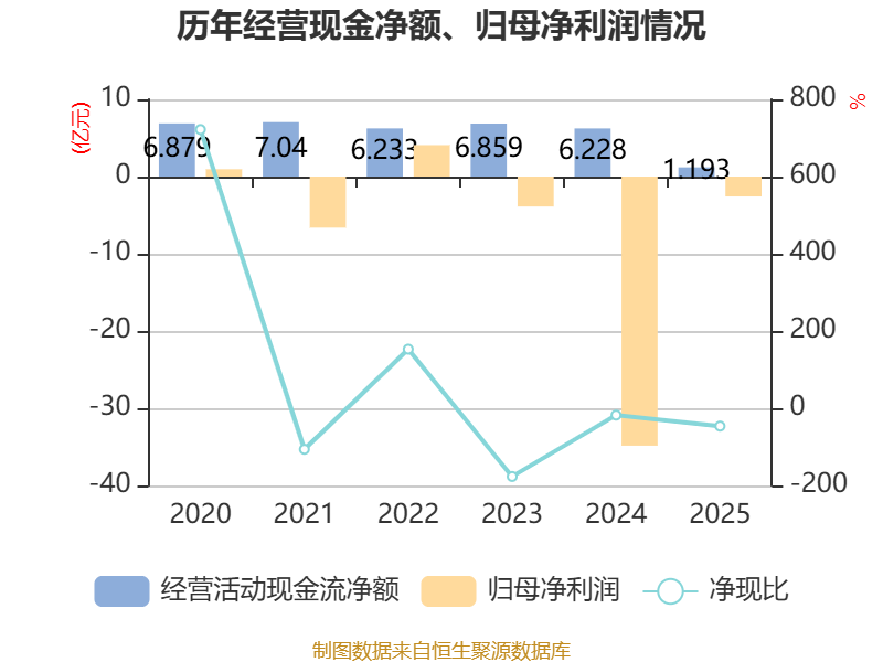 截至2025年,公司经营活动现金流净额为1.19亿元,同比下降80.84%;筹资活动现金流净额-1.52亿元,同比增加2.3亿元;投资活动现金流净额1.24亿元,上年同期为-4.19亿元。