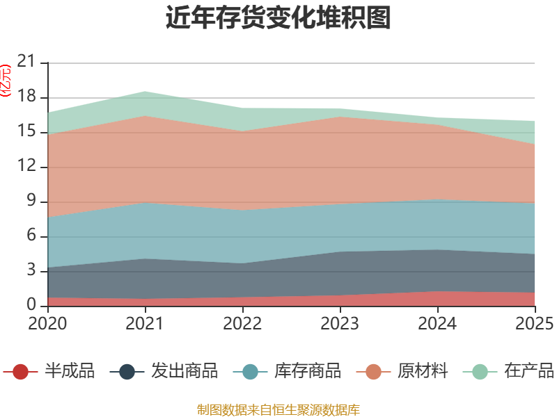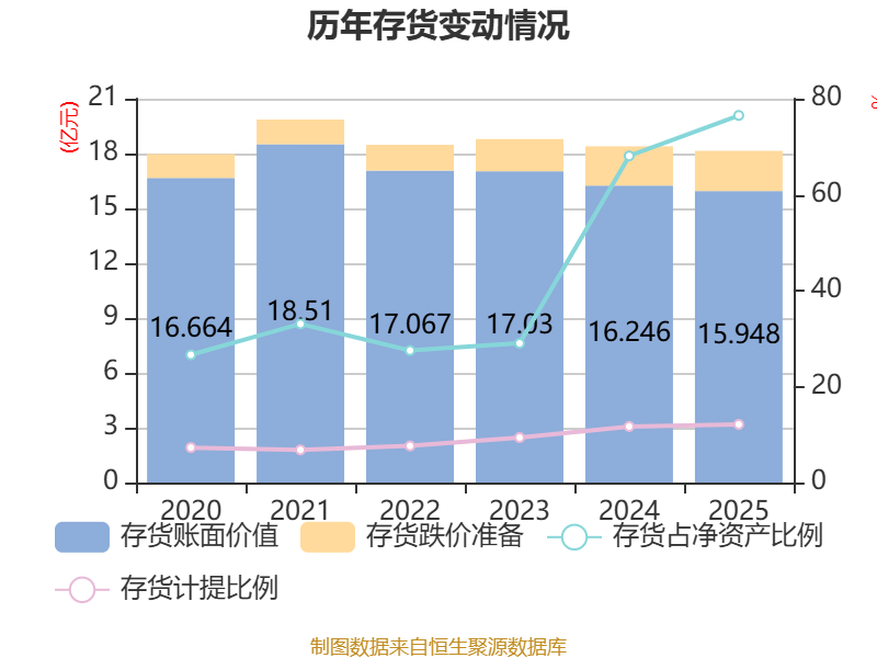从存货变动来看,截至2025年末,公司存货账面价值为15.95亿元,占净资产的76.51%,较上年末减少2975.37万元。其中,存货跌价准备为2.2亿元,计提比例为12.12%。