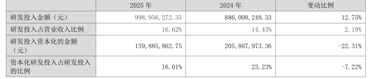 2025年全年,公司研发投入金额为9.99亿元,同比增长12.75%;研发投入占营业收入比例为16.62%,相比上年同期上升2.19个百分点。此外,公司全年研发投入资本化率为16.01%。