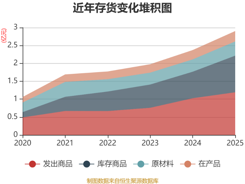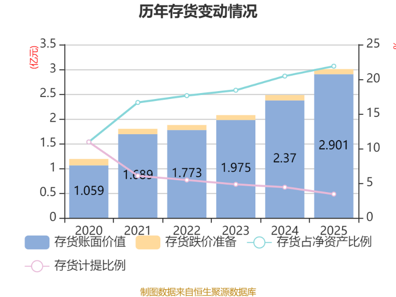 从存货变动来看,截至2025年末,公司存货账面价值为2.9亿元,占净资产的21.88%,较上年末增加5313.24万元。其中,存货跌价准备为1028.51万元,计提比例为3.42%。