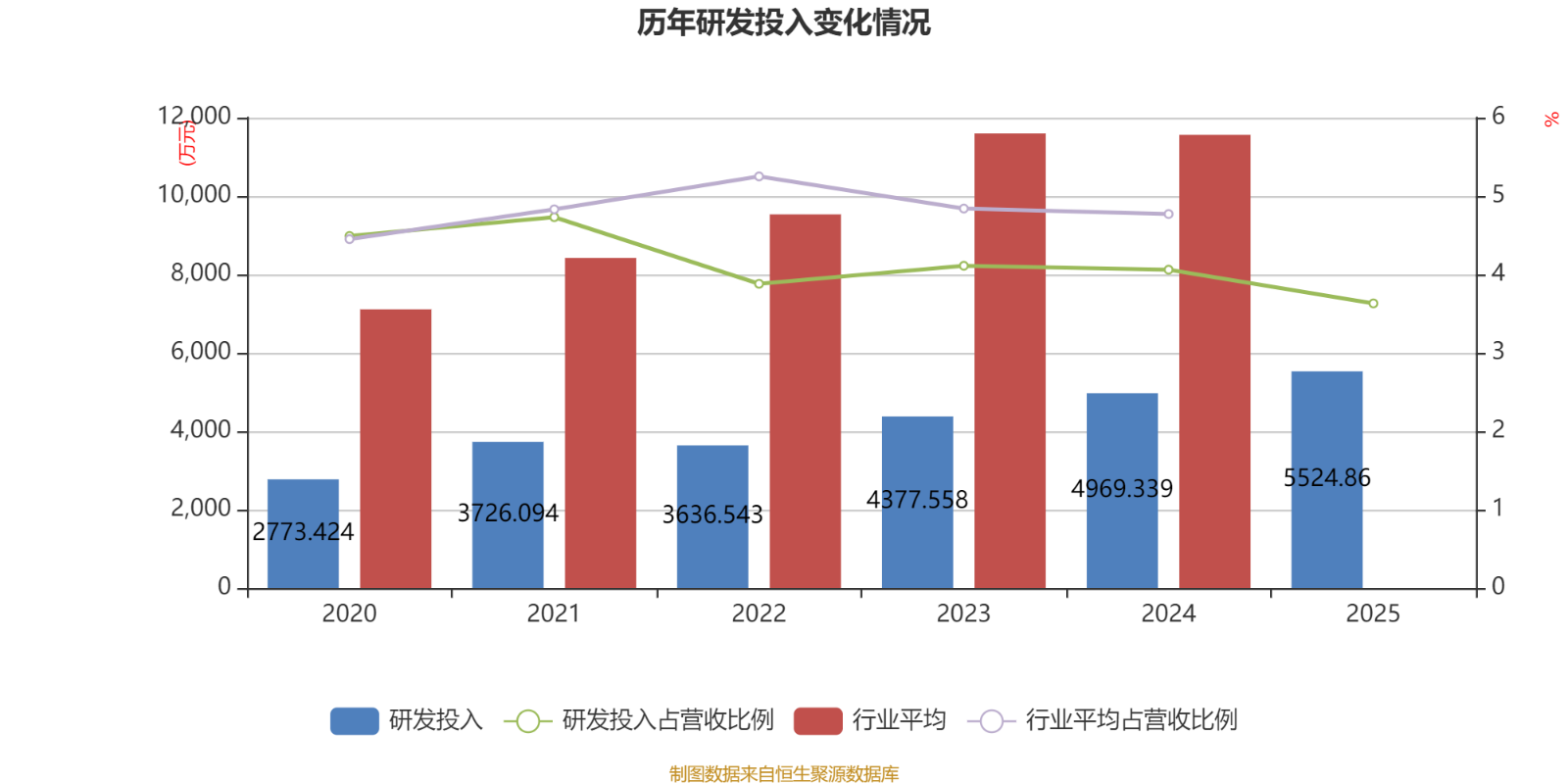 2025年全年,公司研发投入金额为5524.86万元,同比增长11.18%;研发投入占营业收入比例为3.63%,相比上年同期下降0.43个百分点。此外,公司全年研发投入资本化率为0%。