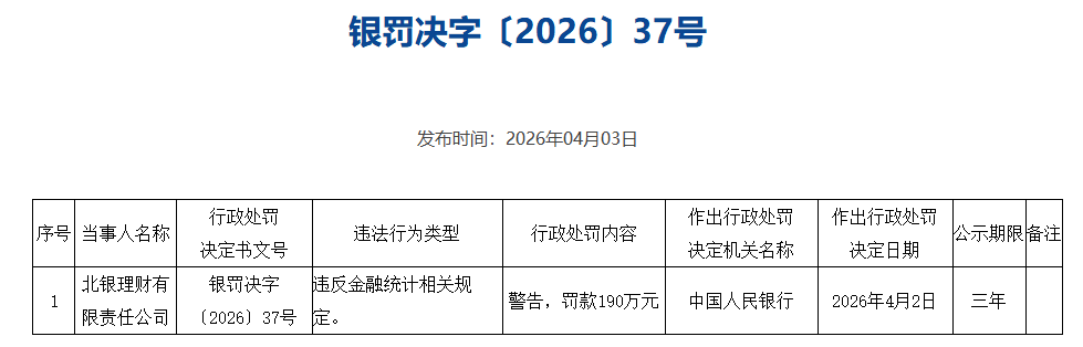 4月3日,中国人民银行公示的行政处罚信息显示,北银理财因违反金融统计相关规定,被中国人民银行予以警告,并处以190万元罚款。据同花顺iFinD信息统计,这是银行理财子公司2026年以来收到的首张罚单,也是北银理财成立以来收到的首张监管罚单。