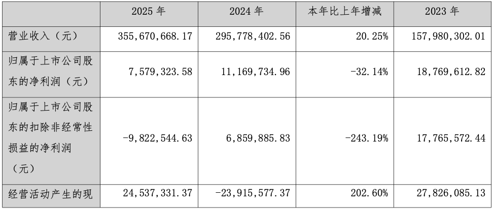4月7日,雅艺科技(301113)公告,公司2025年实现营业收入3.56亿元,同比增长20.25%;归母净利润757.93万元,同比下降32.14%;扣非净利润为-982.25万元,同比下降243.19%。